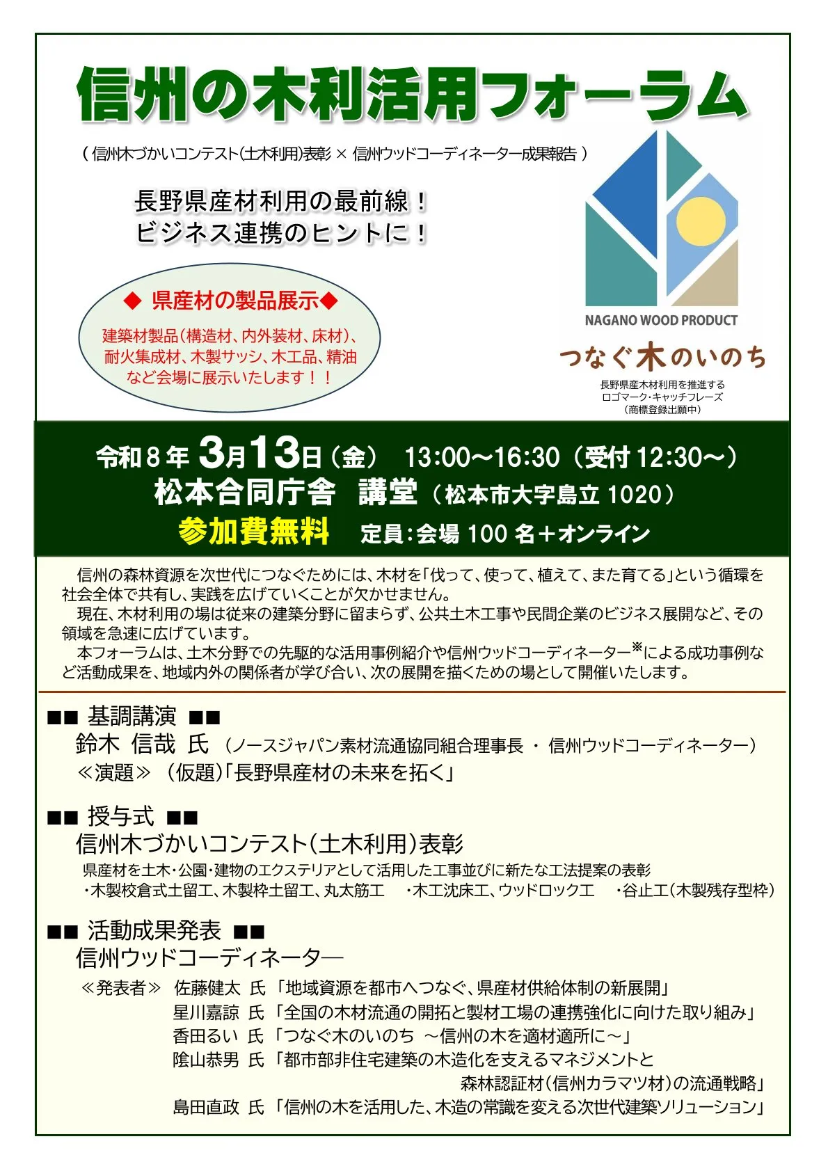本フォーラムは、土木分野での先駆的な活用事例紹介や信州ウッドコーディネーターによる成功事例など活動成果を、地域内外の関係者が学び合い、次の展開を描くための場として開催いたします。
